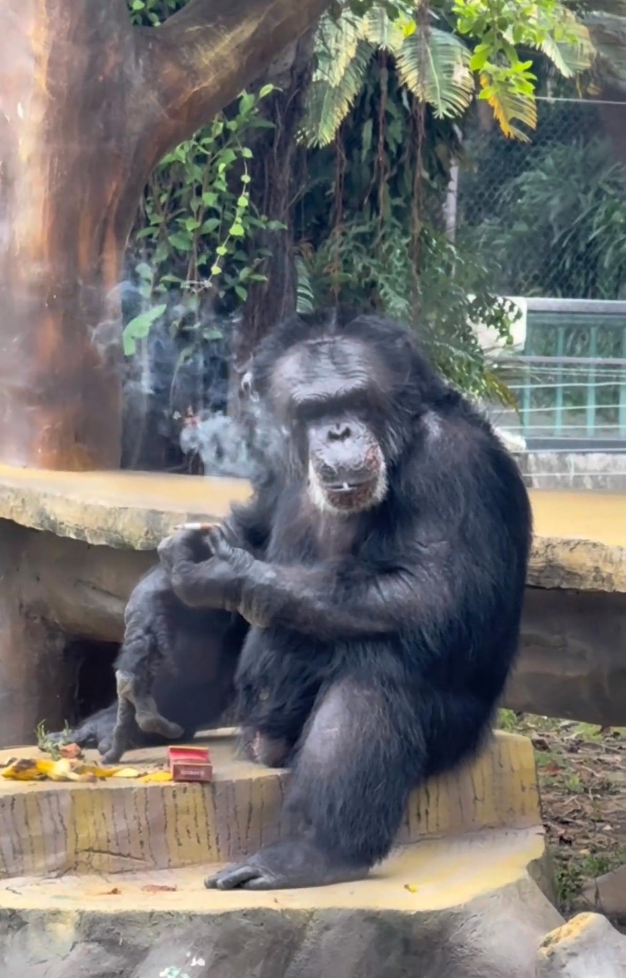 网友发布视频称,南宁动物园一黑猩猩抽烟。