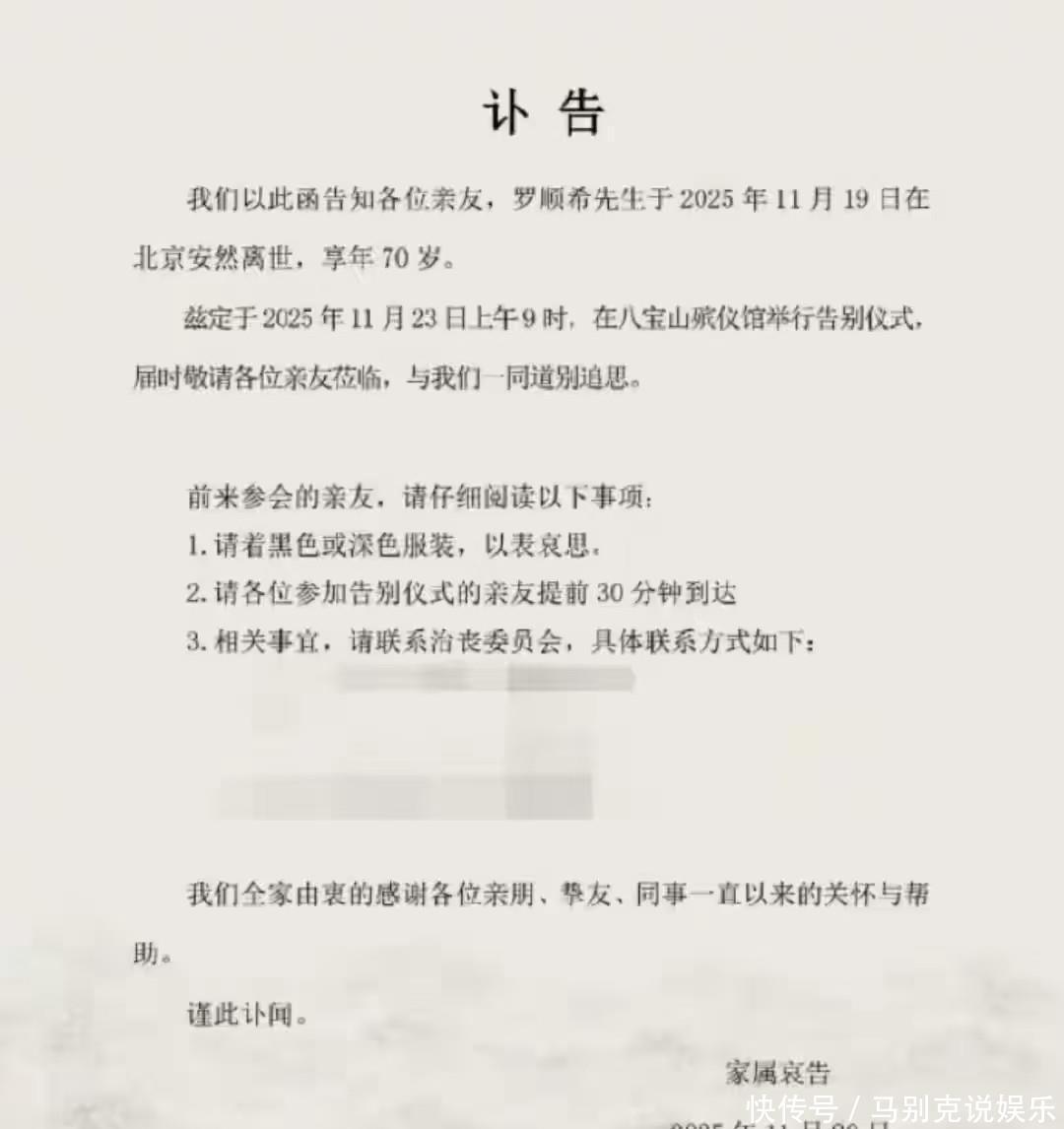 最近,罗晋的经纪人在朋友圈发布讣告。表示罗晋的父亲罗顺希,在11月19号安然离世,享年70岁。