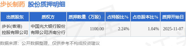 证券之星消息,步长制药(603858)11月10日公开信息显示,股东步长(香港)控股有限公司向中国光大银行股份有限公司济南分行合计质押1100.0万股,占总股本1.04%。质押详情见下表: