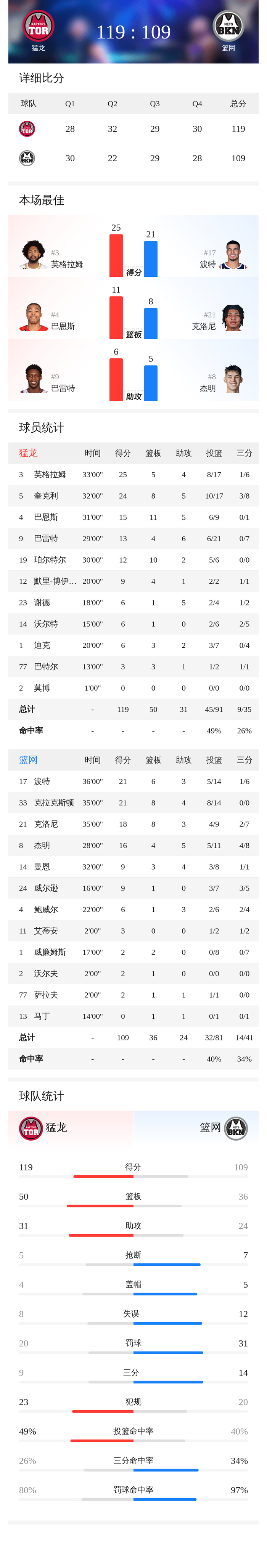 北京时间2025年11月12日,NBA常规赛猛龙客场119-109战胜篮网。猛龙队英格拉姆砍下25分5篮板4助攻,奎克利贡献24分8篮板5助攻;篮网队波特得到21分6篮板3助攻,克洛尼拿下18分8篮板。
