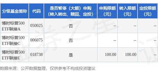 本站消息,11月13日博时基金管理有限公司发布《博时标普500交易型开放式指数证券投资基金联接基金调整大额申购、转换转入、定期定额投资业务的公告》。公告中提示,为保护基金份额持有人利益,自2025年11月13日起博时标普500交易型开放式指数证券投资基金联接基金调整大额申购、转换转入、定期定额投资业务,下属分级基金调整明细如下: