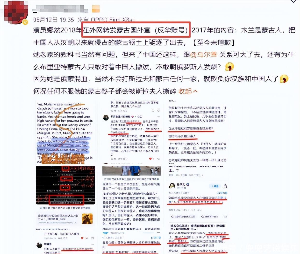但这一扒可不得了,娜然之前的黑历史全被翻出来了。就这条件想进霍家?我看悬!来说说娜然这姑娘,蒙古爸爸俄罗斯妈妈,14年在台湾当模特出道。16年运气爆棚当了周董《告白气球》MV女主,17年又拿下《封神》妲己一角。本来前途一片光明,结果自己作死。18年她在ins上转发什么"木兰是蒙古人"的内容,这不是歪曲历史吗?更离谱的是还转发过说蒙古语里中国是"奴才"的文章。这不是找骂吗?