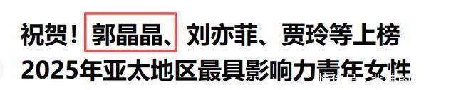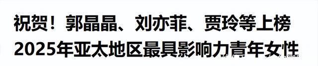 最近,郭晶晶的履历上又增添了浓墨重彩的一笔。 官媒发文,一项新的荣誉让她再次进入公众视野——郭晶晶与刘亦菲、贾玲等人一同上榜,成为今年亚太地区最具影响力青年女性之一。