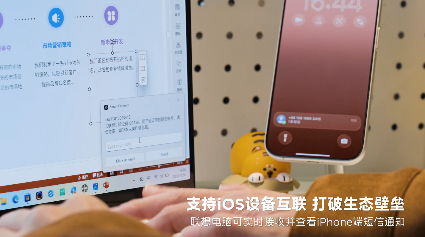 联想全新超级互联 3.0 还新增兼容 iPhone 设备,联想电脑、平板、moto 手机可与 iPhone 跨生态互联,支持实时接收查看 iPhone 端短信(电脑)、传输文件等。
