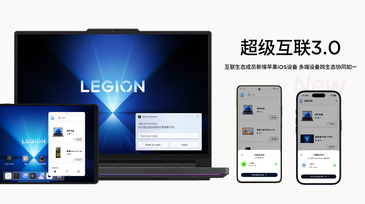 据介绍,联想全新超级互联 3.0 交互界面换新,提供短信、屏幕共享、网络摄像头、电脑模式、键鼠穿越、热点等功能,同时支持跨端文件管理。